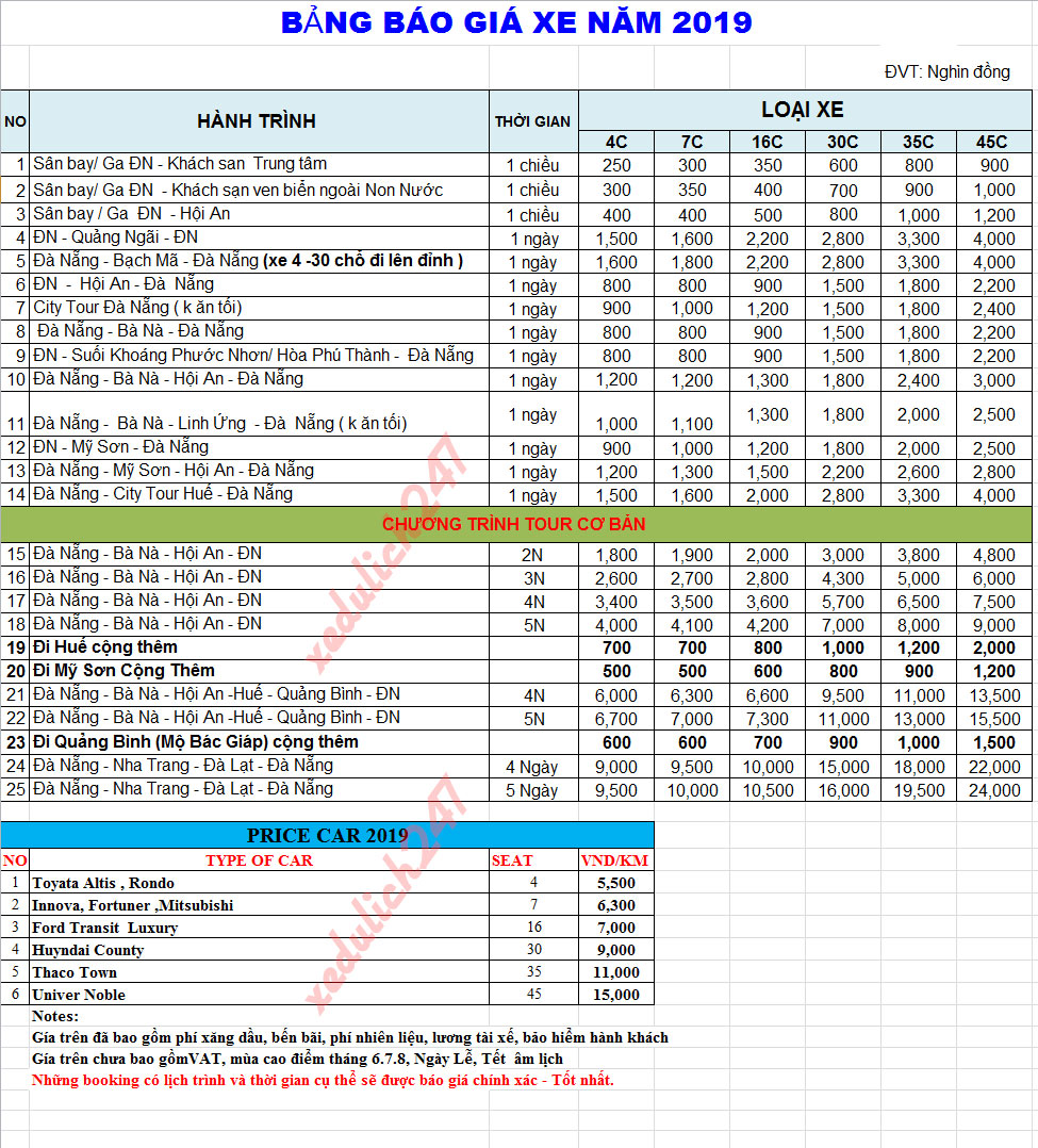Bảng giá dịch vụ thuê xe của chúng tôi